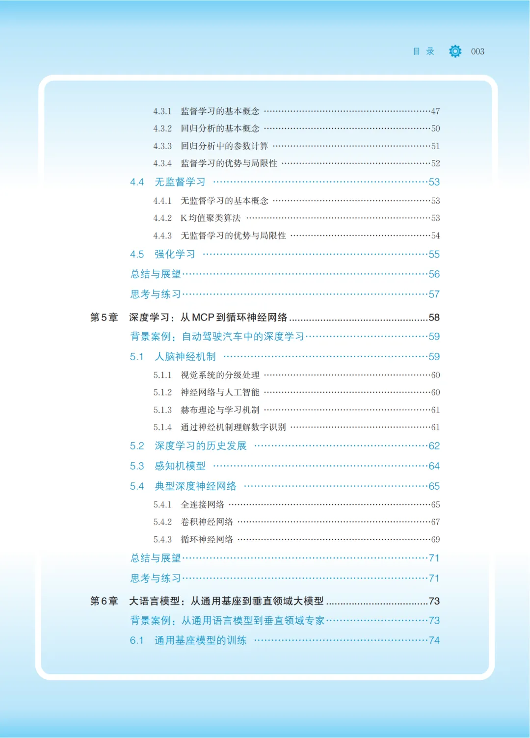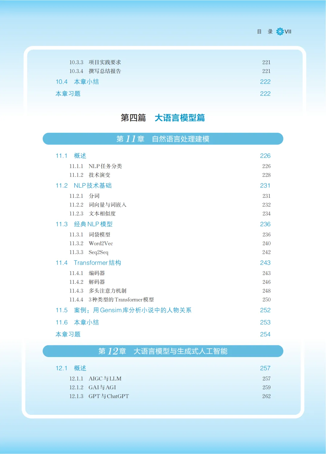 全书以通识技术基础为主线,按照由浅入深、层层递进的架构来组织,划分为四篇共13章。第一篇是基础入门篇,对应第1-3章,介绍入门人工智能学习相关的基础知识。第二篇是机器学习篇,对应第4-6章,重点介绍机器学习相关的基础知识。第三篇是深度学习篇,对应第7-10章,重点介绍神经网络深度学习相关的基础知识。第四篇是大语言模型篇,对应第11-13章,重点介绍当前比较热点的自然语言处理建模、AIGC和大模型微调等有关知识。