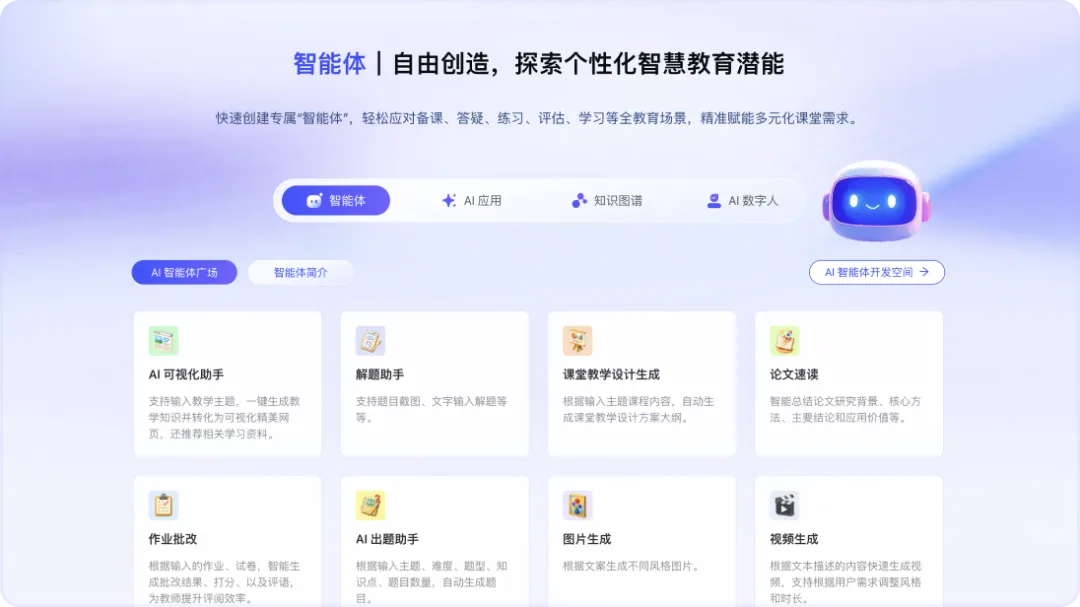 平台提供智能体中心和AI应用中心,快速创建专属“智能体”,轻松应对通识课实操场景,并赋能备课、答疑、练习、评估等全教学场景,精准赋能多元化课堂需求。
