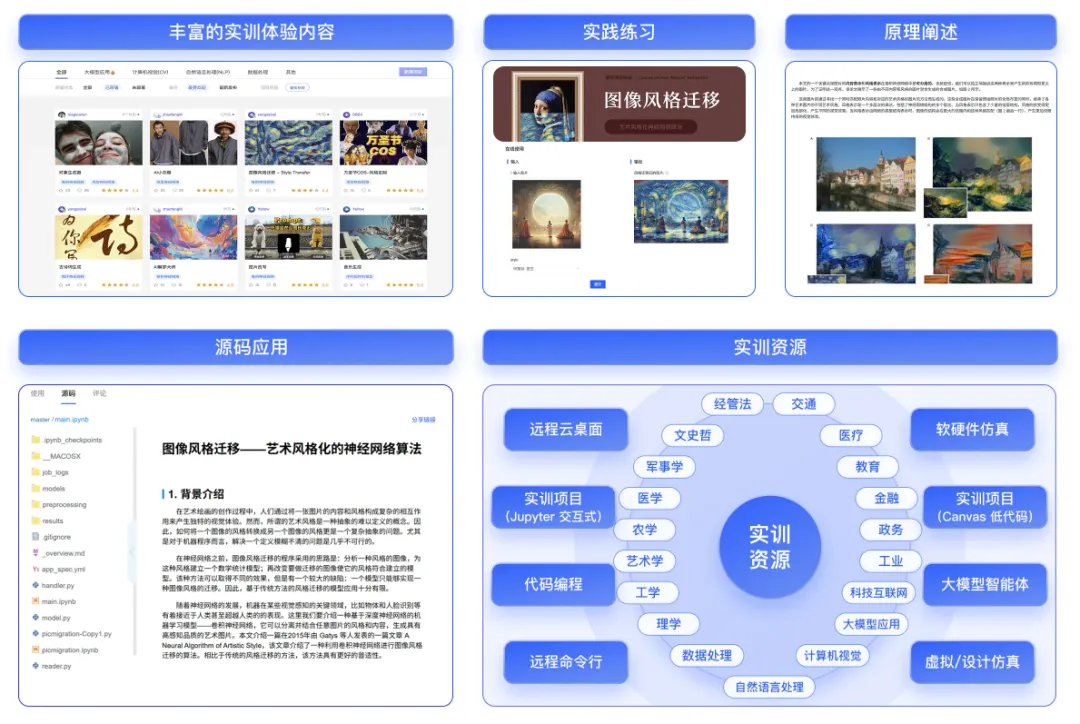 平台提供可自动评分的实训作业,包含趣味模型实践、经典算法应用、前沿交叉等,满足自然语言处理、计算机视觉、数据分析、大模型等方向的大规模自动评分作业场景。以及提供丰富的实训体验内容,便于开展理论实践一体教学,快速了解典型算法的应用场景,并且可利用一项实训资源开展(体验、科普、实验)三层次教学。