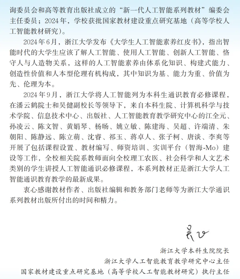 浙江大学系列以教材建设为基石,系统构建数智化教学体系,帮助学生夯实人工智能知识框架、强化实践应用能力,从而推动人工智能教育实现从“知识本位”向“能力本位”的深刻转型。这一探索不仅是浙江大学在人工智能通识教育领域的前沿实践,更是面向智能时代人才培养范式变革的关键引领。