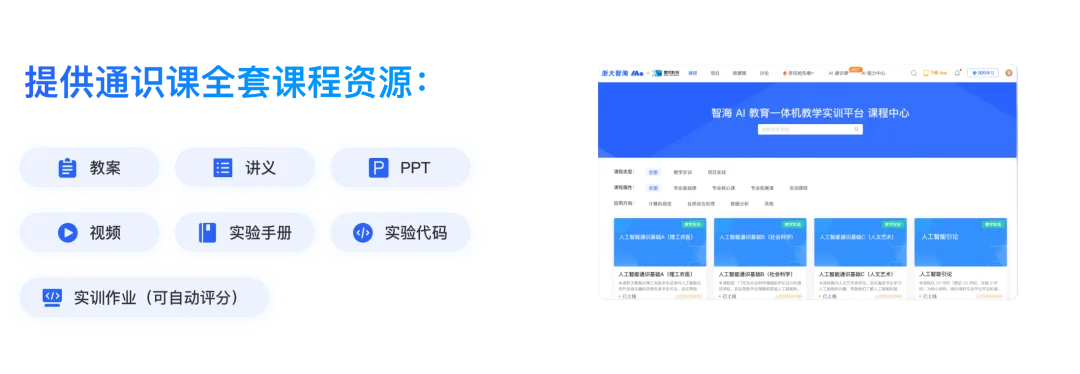 课程模块平台提供浙江大学人工智能通识基础通识课全套课程资源,包含:教案、讲义、PPT、视频、实验手册、实验代码(已跑通)、实训作业(可自动评分)。平台还提供多样的课程资源与资源支持环境,能够开展理论与实践双轨制教学。支持AI通识课、Python程序设计基础、机器学习、深度学习和强化学习、大模型等多个人工智能系列知识要点的备课、教学实施和相关管理工作。