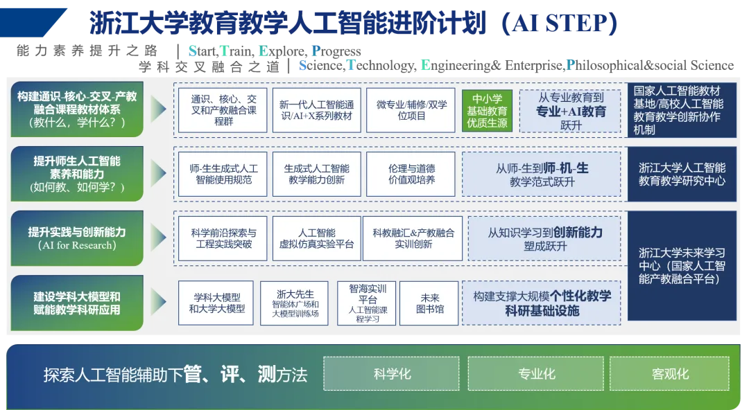 2025年3月1日,在第四届华五教育论坛上,浙江大学正式推出“浙江大学教育教学人工智能进阶计划(AI STEP)”,以Start,Train,Explore,Progress为进阶路径,以“Science,Technology,Engineering&Enterprise,Philosophical&social Science”为学科交叉融合之道,推动AI与教育教学深度融合,构建智能时代拔尖创新人才自主培养新范式