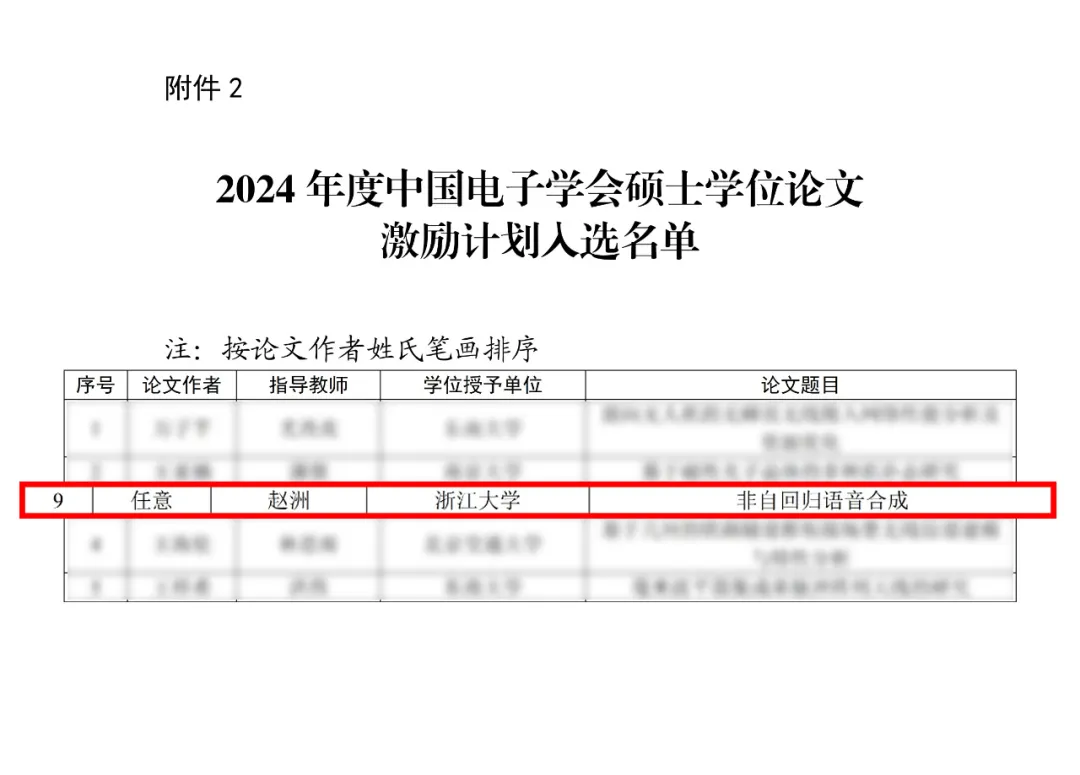 近日,中国电子学会公布了2024年度中国电子学会博士/硕士学位论文激励计划的入选名单,我院2022届硕士毕业生任意的学位论文《非自回归语音合成》入选硕士学位论文激励计划,导师为赵洲教授。