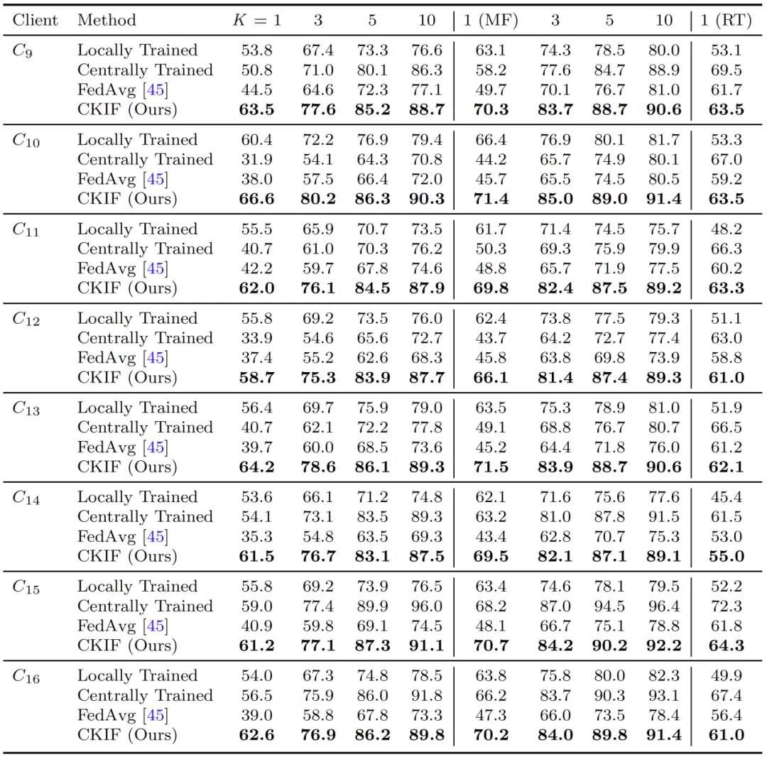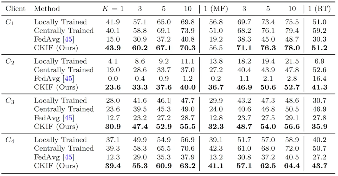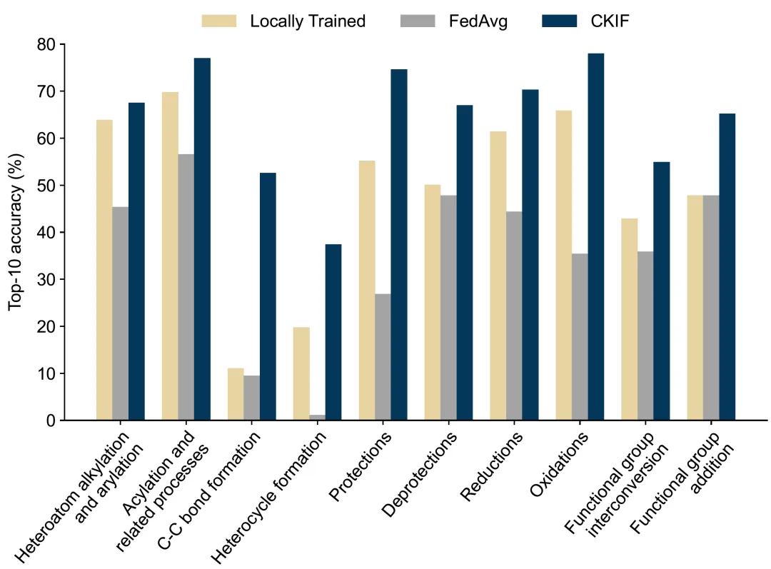 在基于USPTO-50K数据集的四客户端实验设置下,CKIF框架在多项指标上显著优于各参与方独立训练的“本地化学习”模型(Locally Trained)。同时,其性能全面超越主流联邦学习方法FedAvg,在部分任务上甚至达到或超过依赖数据集中化的“中心化学习”模型(Centrally Trained),展现出强大的协同建模能力。