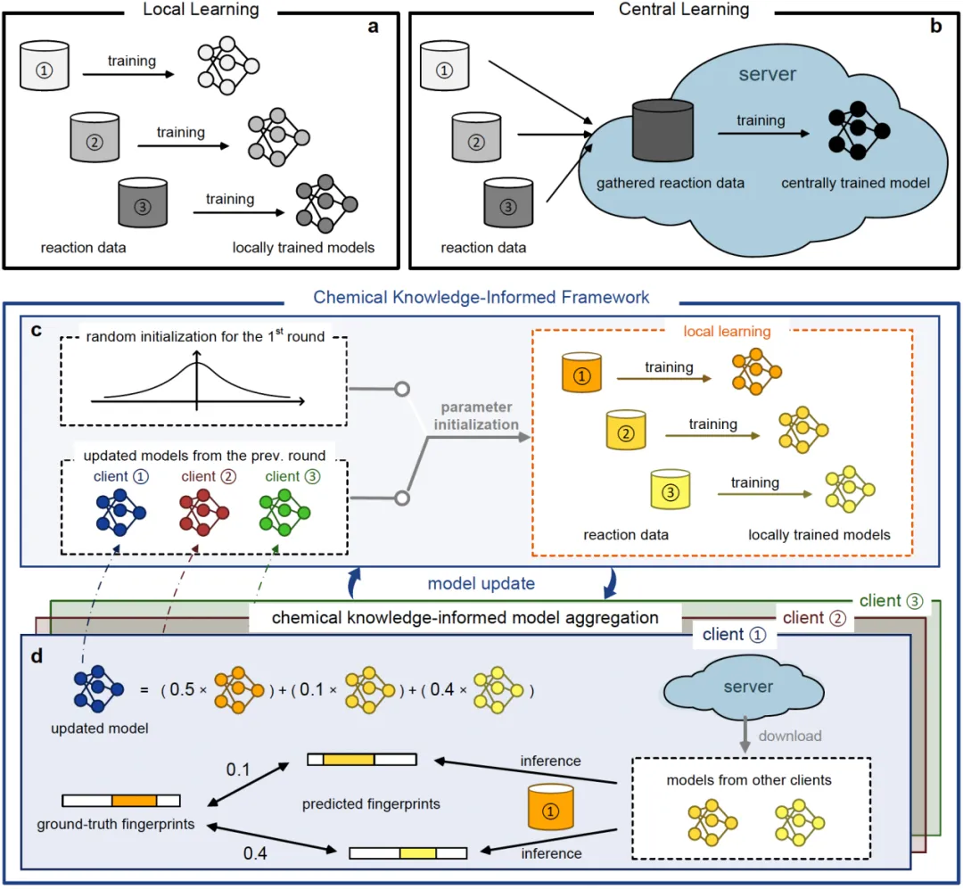 然而,当前主流的机器学习逆合成方法,无论是基于模板、无模板还是半模板的,均依赖于同一种训练模式:将来自多方的化学反应数据汇聚至单一中心服务器,进行集中式模型训练。这一模式与当前现状存在很大差距:化学反应数据是高成本积累的宝贵资源,也涉及企业的核心技术机密、知识产权与竞争优势。出于商业保密与数据安全的考虑,各大机构对共享原始数据普遍持高度审慎态度,导致了“数据孤岛”现象:大量有价值的数据被封锁在各自机构内部,难以共享。