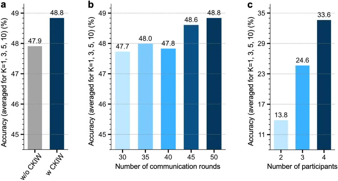 为验证CKIF的核心机制及其在不同配置下的稳定性,研究系统评估了化学知识引导权重策略(CKIW)的有效性及模型对关键超参数的敏感性。实验表明,采用CKIW的模型优于基于数据量加权的传统聚合方式。同时,模型准确率随通信轮数增加而持续提升,展现出良好的收敛性;在2至4个客户端的设置下,性能随参与方数量增加而显著上升,表明框架具备良好的可扩展性。