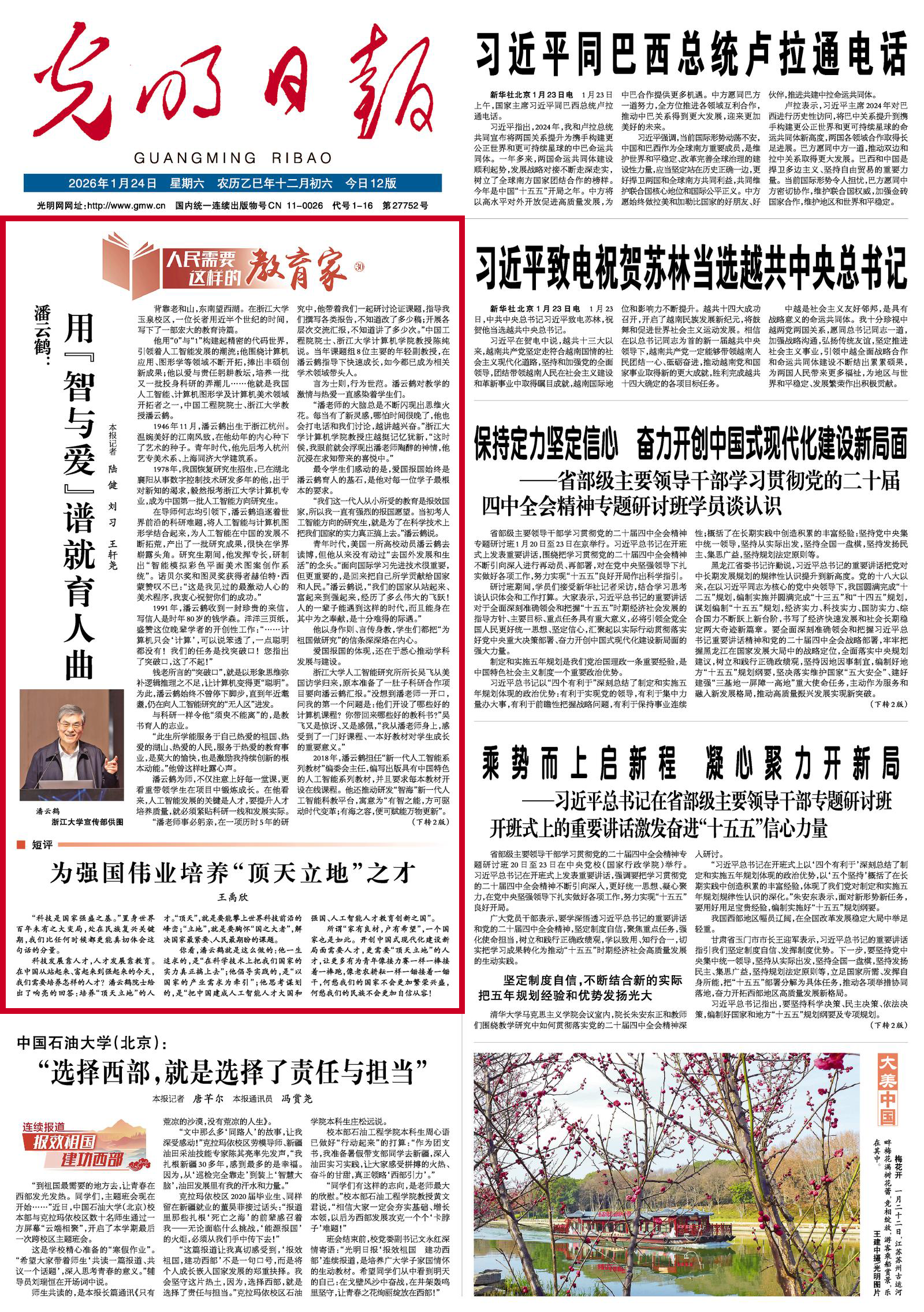 1月24日,《光明日报》以“人民需要这样的教育家”为主题,刊发关于中国工程院院士、浙江大学教授潘云鹤的人物报道——《潘云鹤:用“智与爱”谱就育人曲》。