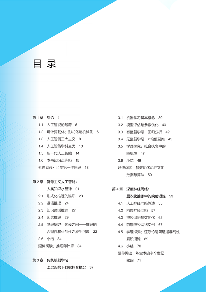 (4)涵盖知识范围:人工智能绪论、符号主义人工智能、传统机器学习、深度神经网络、强化学习、生成式人工智能、智能赋能等内容,适合于高等学校的学生以及感兴趣读者进行人工智能通识课程学习。